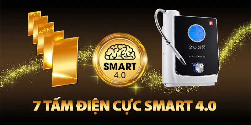 FUJI SMART K8 cũng sở hữu điện cực thế hệ SMART 4.0. Nếu SMART I8 chỉ có 5 tấm điện cực thế hệ mới thì SMART K8 có đến 7 tấm điện cực SMART 4.0 này. Chỉ với 5 tấm điện cực thế hệ mới đã hơn 7 tấm điện cực thế hệ cũ, thì với 7 tấm điện cực SMART 4.0, SMART K8 còn vượt trội đến như thế nào so với các máy điện giải được có công nghệ điện cực thông thường.