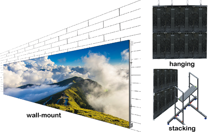 Ngoài ra, màn hình LED ghép có thể gắn lên bất cứ bề mặt nào nhờ hệ thống giá treo linh hoạt. Tuỳ theo nhu cầu sử dụng, các tấm màn hình LED có thể được gắn lên tường, tạo thành một bức tường hiển thị vô cùng ấn tượng và đầy tính thẩm mỹ, treo lên trụ đứng, hoặc xếp chồng thành một màn hình đứng trên mặt phẳng nhờ hệ thống giá đỡ chịu lực phía sau. Thiết kế linh hoạt giúp màn hình LED ghép đáp ứng được mọi yêu cầu của khách hàng, từ màn hình sân khấu, màn hình sân vận động cho tới những biển quảng cáo khổng lồ trên các toà nhà cao tầng...